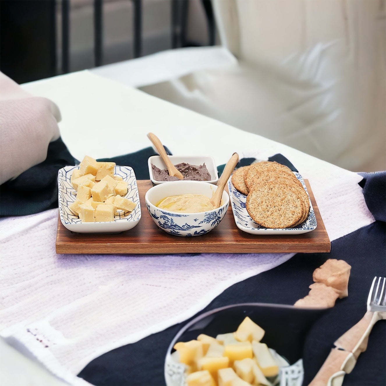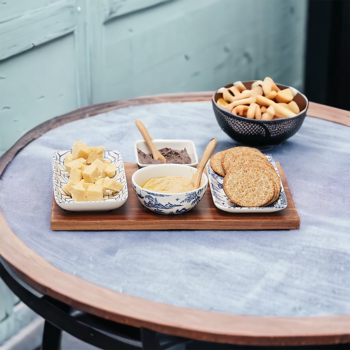 A beautiful 7 piece serving set to entertain for your guests. Each piece in a porcelain matte finish with designs and colors of blue and white. All placed on a wonderful acacia wooden tray.