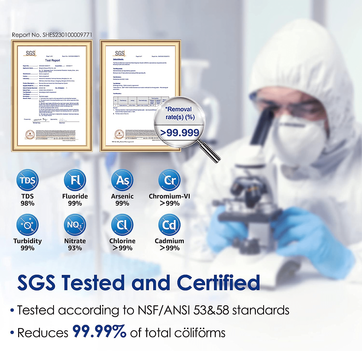 In the entire filtration process, the system reduces most of harmful substances like chloramine in your tap water, reduces TDS and significantly improves water taste.