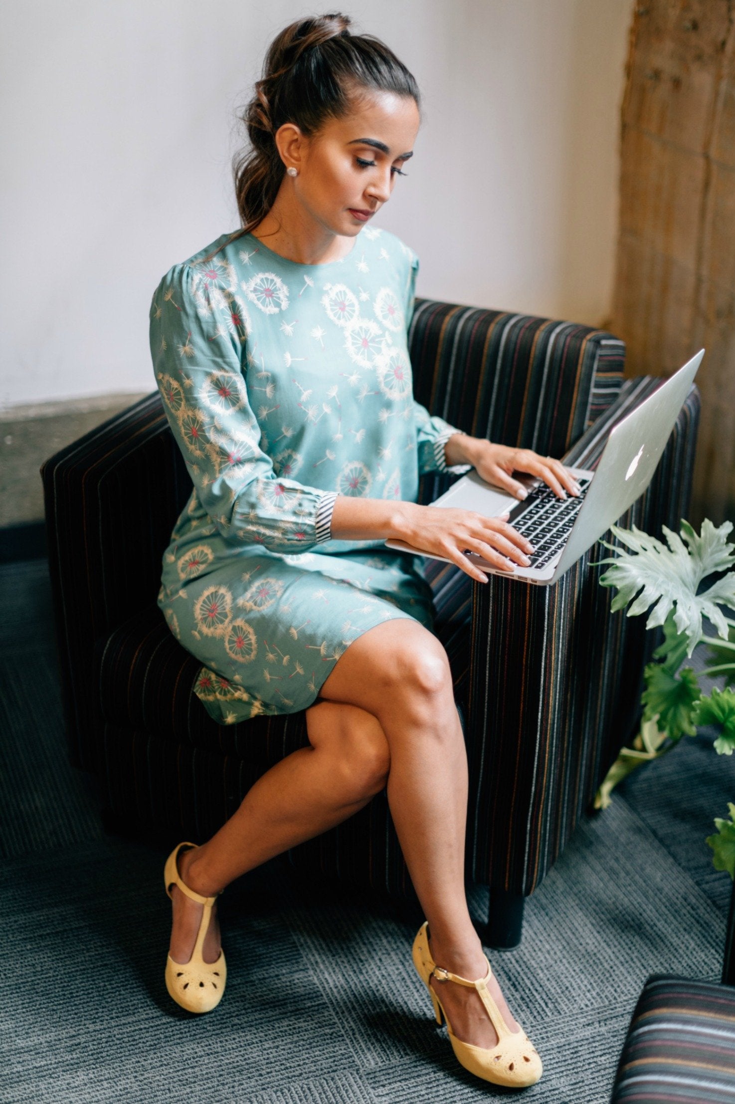 The Dancing Dandelion dress makes getting ready for work a breeze! Its soft fabric slips on like a nightgown and the playful print gives just the right balance of polish and eye-catching personality. - Made in the USA
