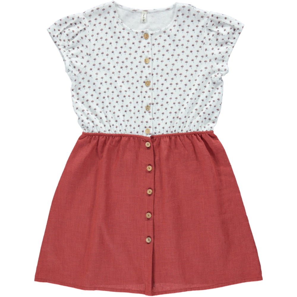 Front closure with an olive wood button, balloon sleeves, elasticised waist.