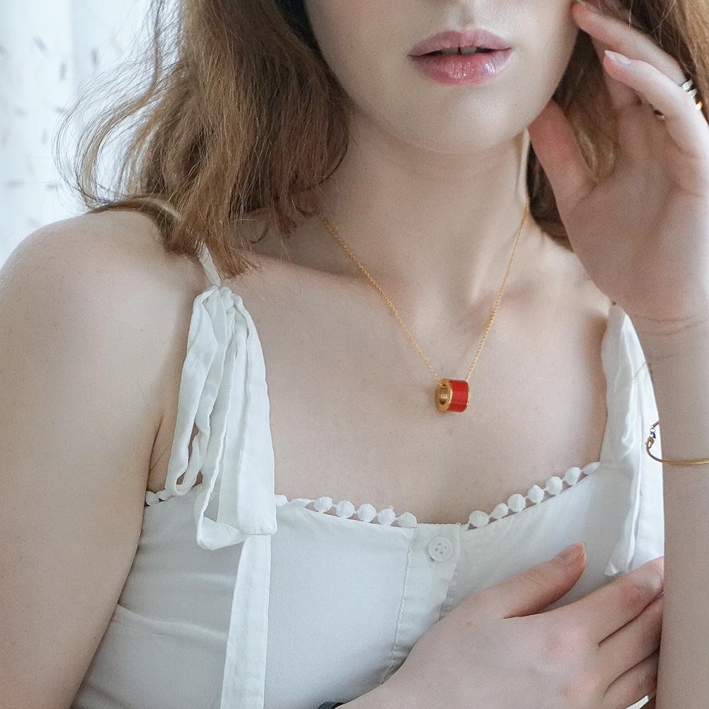 Red/Blue circle pendant necklace made with enamel- a classic and fashion style of pendant necklace. The coordination of the color is excellent and relaxing. Wearing it on your neck, it will be charming in the crowd.