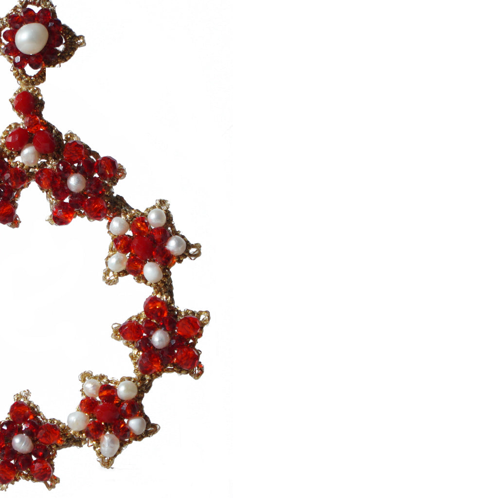 Our painstaking craftwomen, dedicate hours and sacrifice in refining the technique through the search of natural stones and crystals that create fascinating and universal contrasts and high quality yarns whose bows leaves and ‘ pippiolini’ combined give rise to unique geometric figures and hard to imitate in equal measure, where even the small imperfections, specific to the craftsmanship , make every jewels authentic.