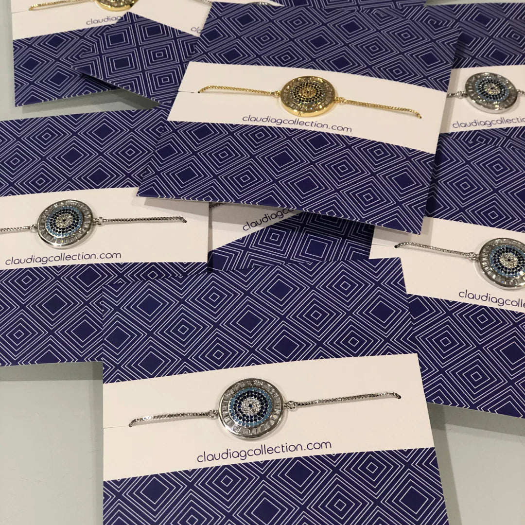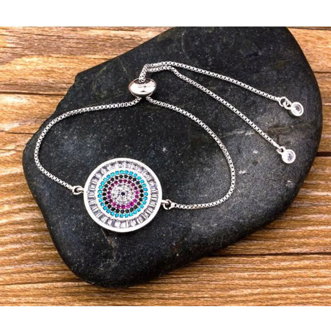 Adjustable pull bracelet with Greek Eye center piece made up of Cubic Zirconia and color rhinestones.