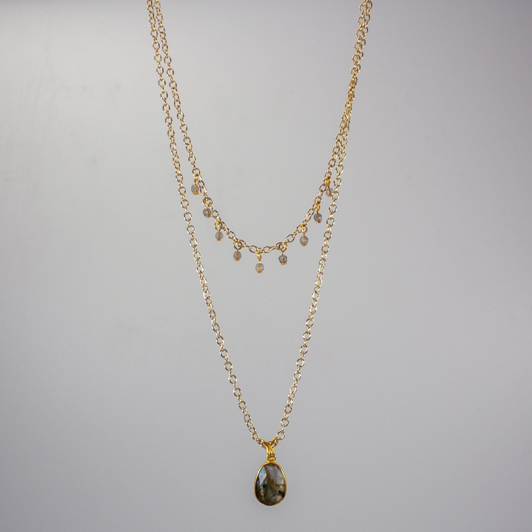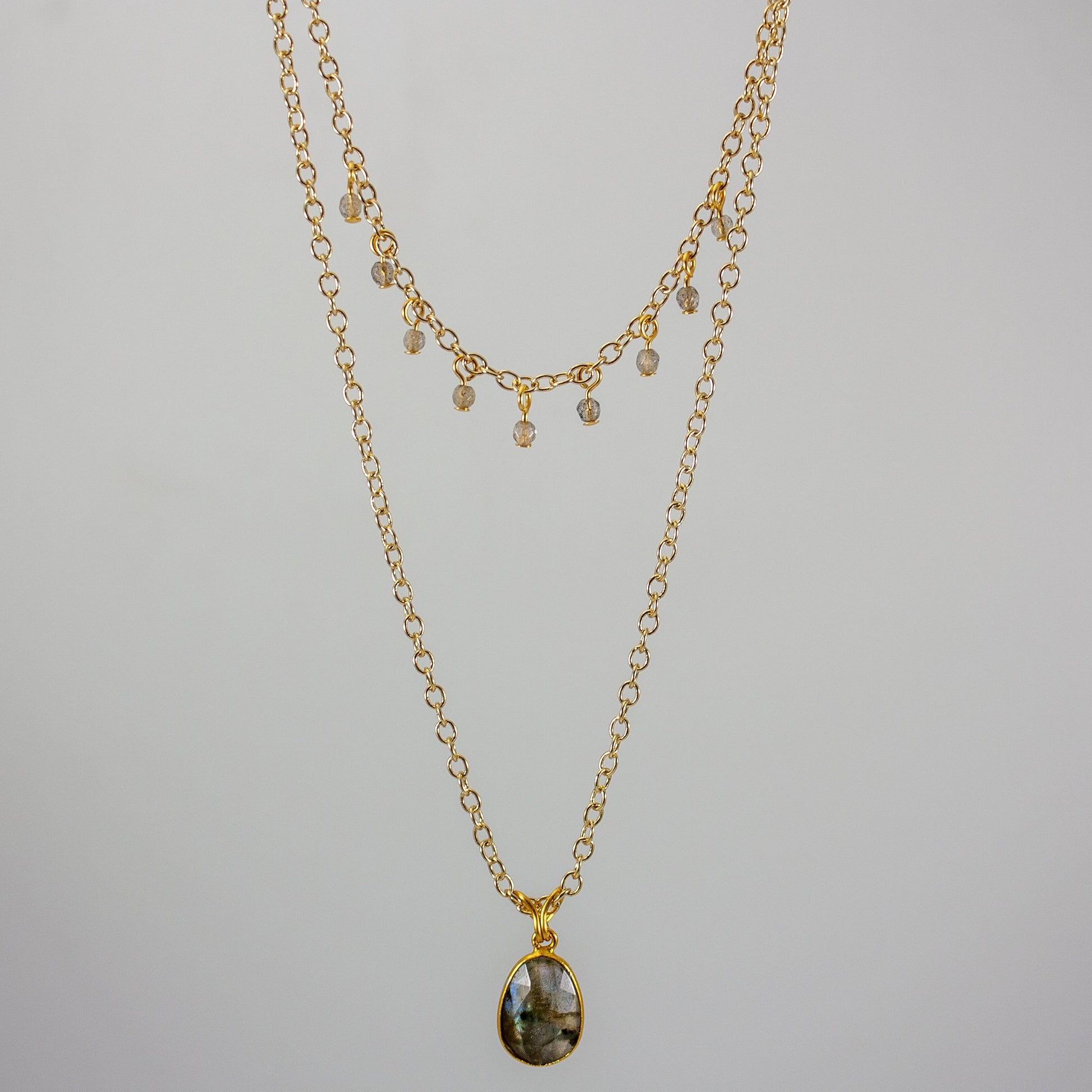 Labradorite never looked so lovely. An absolutely gorgeous necklace with a 16" beaded layer and 22" pendant layer. These two layers are completely in harmony showcasing the uniqueness of labradorite, called labradorescence. Stunning flashes of green, yellow, and blue will dazzle you and it wouldn't be surprising if this didn't become a favorite.