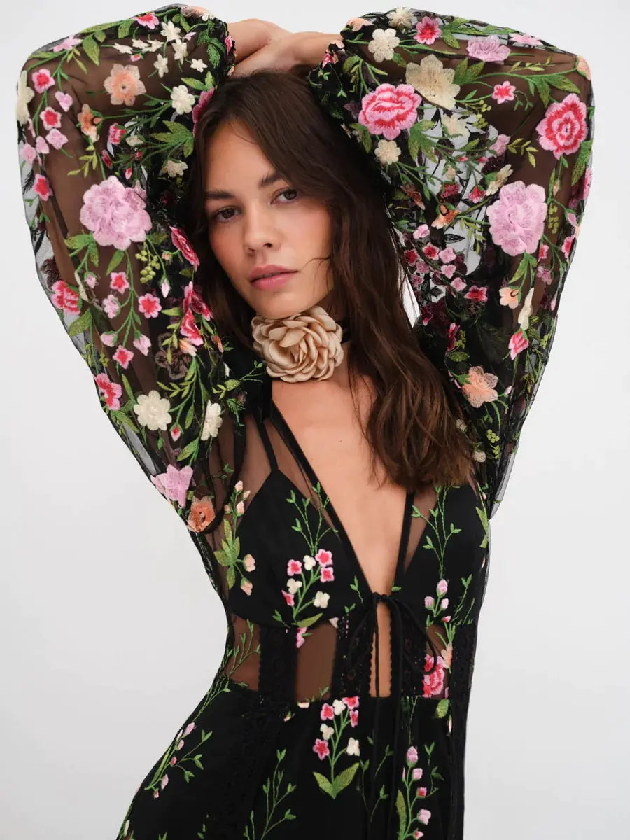Enjoy the allure of our backless, see-through floral dress, perfect as a bikini cover-up or standalone statement piece.