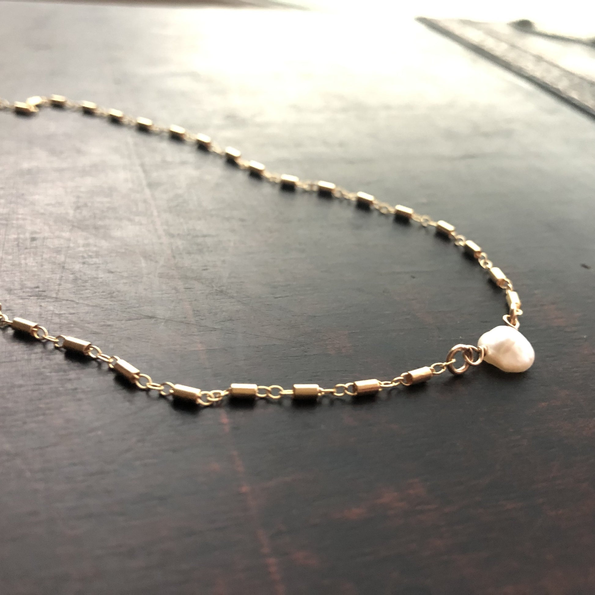 Keshi pearls are highly prized for their extraordinary luster and organic shapes. Each Marilena necklace will be unique and magnificent highlighting a gorgeous Keshi white pearl wire-wrapped on Gold fill bar & link chain.