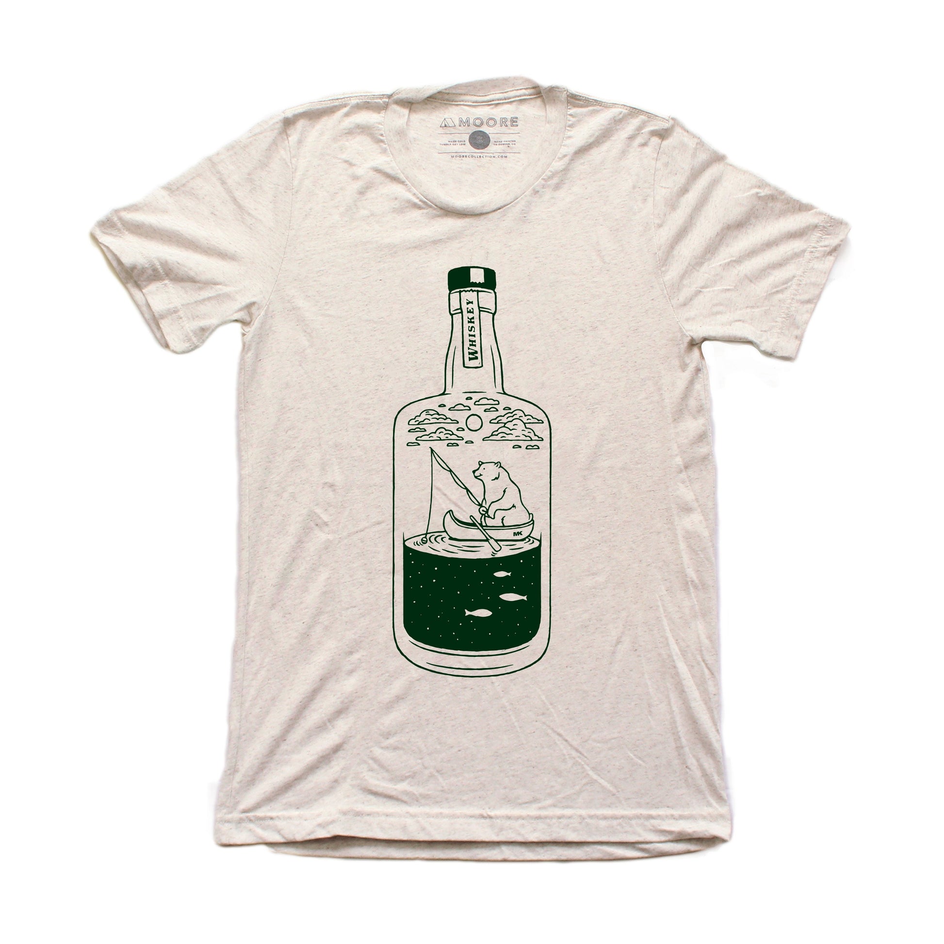 Our Moore x Mountain Khaki Whiskey Bear Tee in oatmeal is a screen printed t shirt with forest green water-based ink. With a retail fit, this incredibly soft t shirt is made out of a tri-blend of 50% polyester, 25% cotton, and 25% rayon. Our soft mens t shirts are unisex in wear.