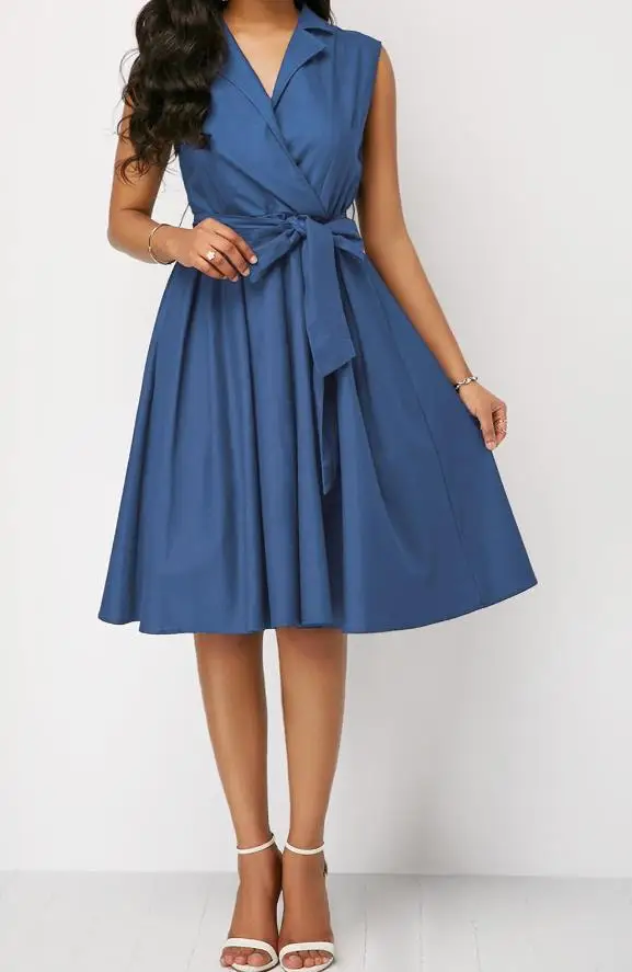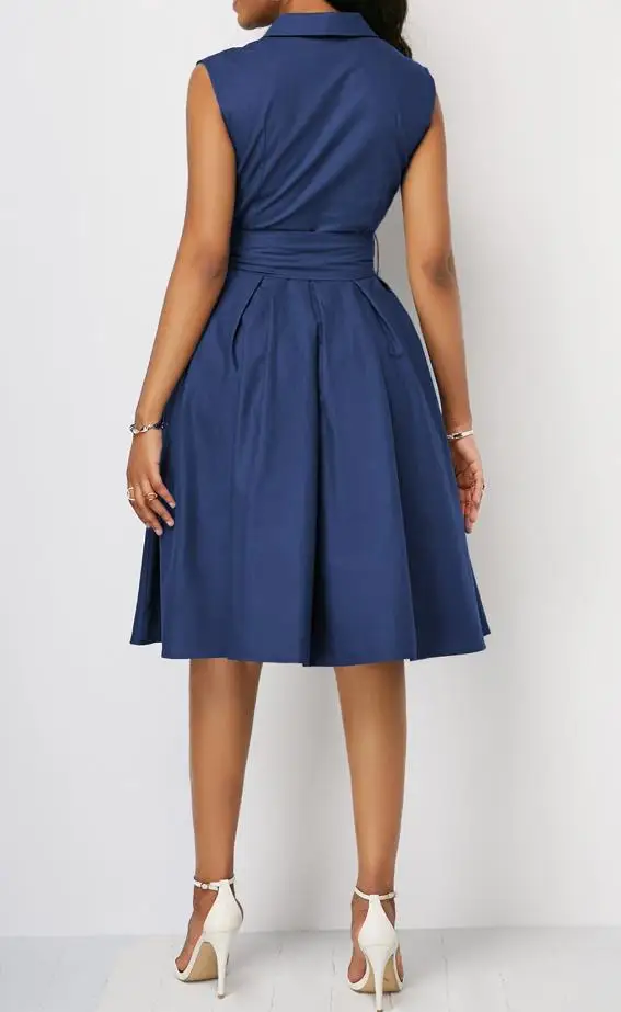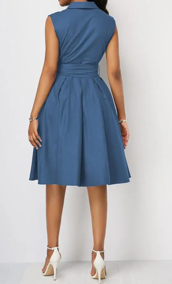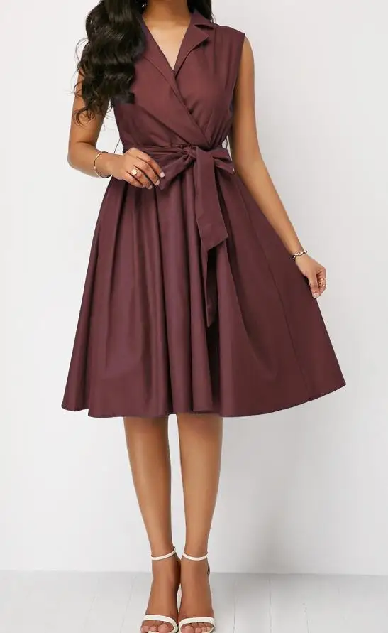New Fashion 2023 Summer Casual Solid Color Waist Sleeveless Lapel Tie A-Line Commuter Dress Elegant Dresses for Women