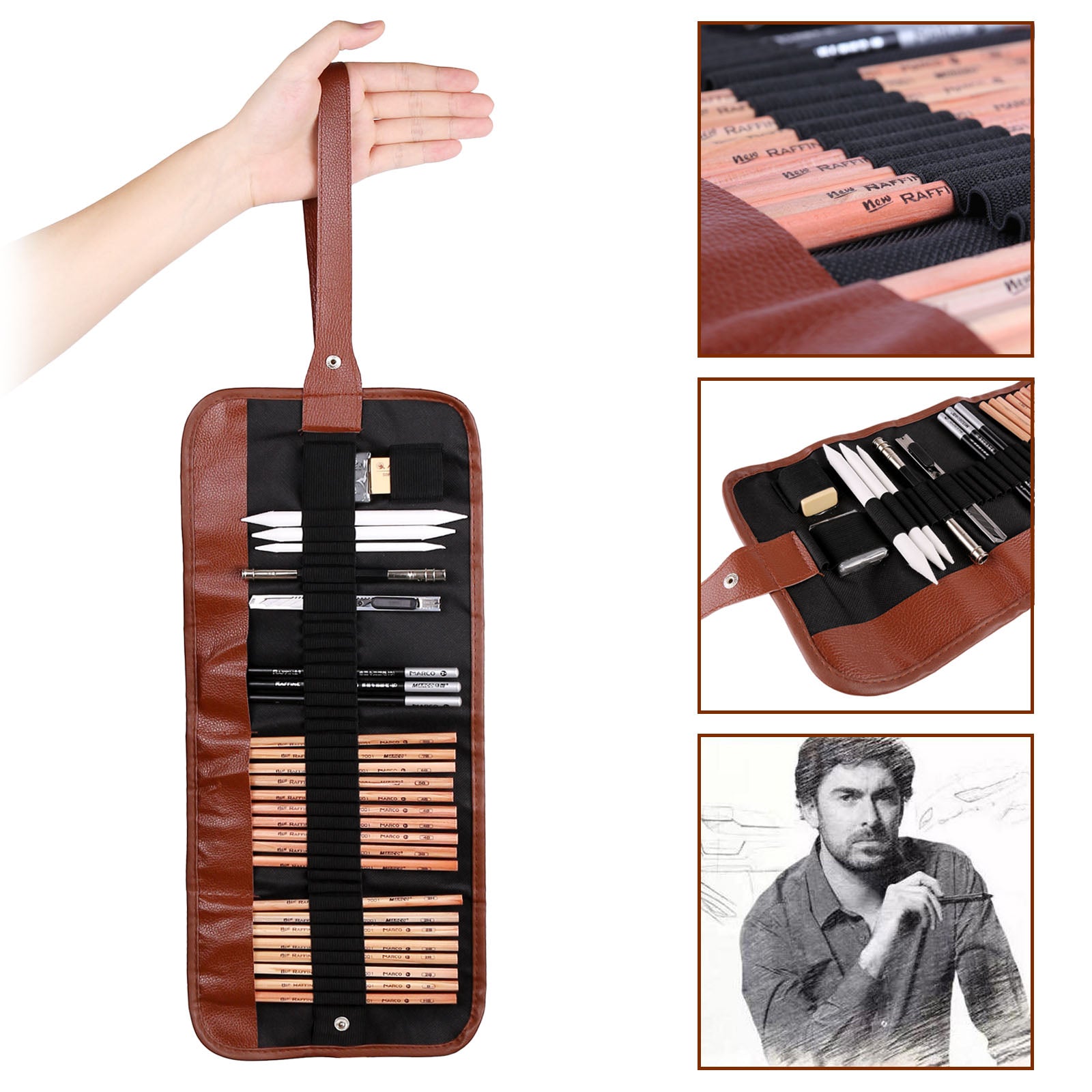 Great quality: Durable break-resistant metal craft knife + Stylish, lightweight, well-made canvas roll bag + Premium sharpened Pencils + Metal double-end pencil extender.