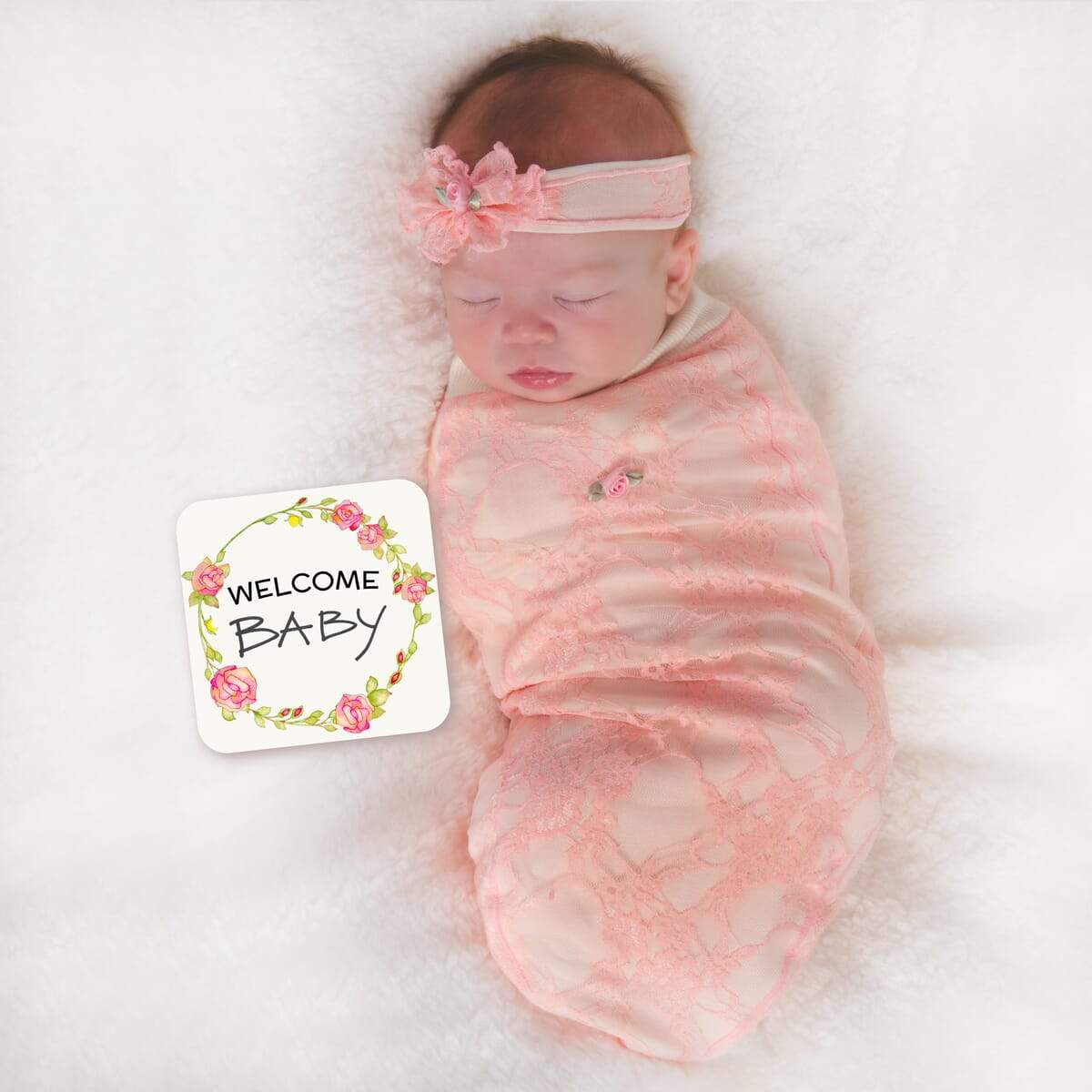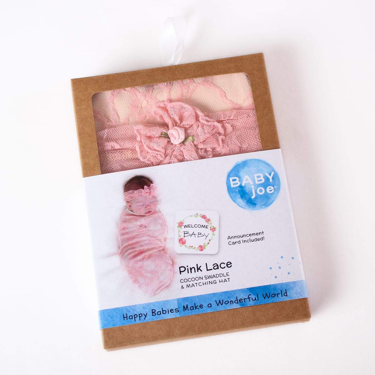 - Includes baby cocoon swaddle, matching headpiece and newborn announcement card.