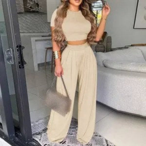 Two Piece Sets Elegant Print Short Sleeve Shirt Pullover + Wide Leg